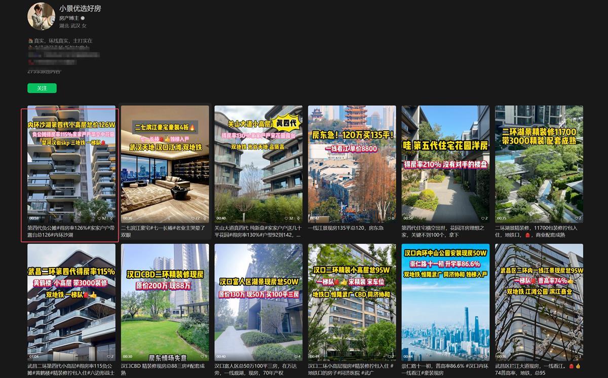 纵目消息记者防备到,墨守成规的,再有短视频账号“斗室姐的买房日记”等。该账号巨额利用边疆第四代住屋视频,以此伪制为武汉楼盘,打出“武汉第四代住屋”等巨额失实实质获客引流。个中颁布的一条视频,转评赞合计抢先5万。