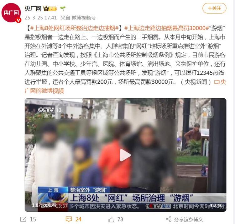 自2025年3月中旬起,上海正在寰宇率先启动室外“逛烟”经管试点职业,采取武康道、新六合等8个中外旅客辘集、人流量大的“网红”地标行为首批演示区。这项立异方法以柔性劝导代庖罚款惩戒,通过“劝你善良”的形式劝导民众文雅手脚,已经执行便激发社会各界的普及热议,“发起寰宇扩充”的呼声接连升温。