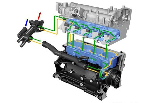 1.4TSI动员机应用的双轮回冷却编制采用双节温器驾驭,关于通过缸体和缸盖的区别温度的冷却水发生一个离开的冷却水导向,差别对缸体和缸盖举办巨细轮回驾驭。冷启动时只正在缸体内开启小轮回,使得缸体急速加热,高的缸体温度有利于减小曲柄连杆机构的摩擦,消重驱动磨损,同时缸盖的大轮回并不会受到过问,因而冷却机能更好,消重了进气温度,同时抬高了充气效用。